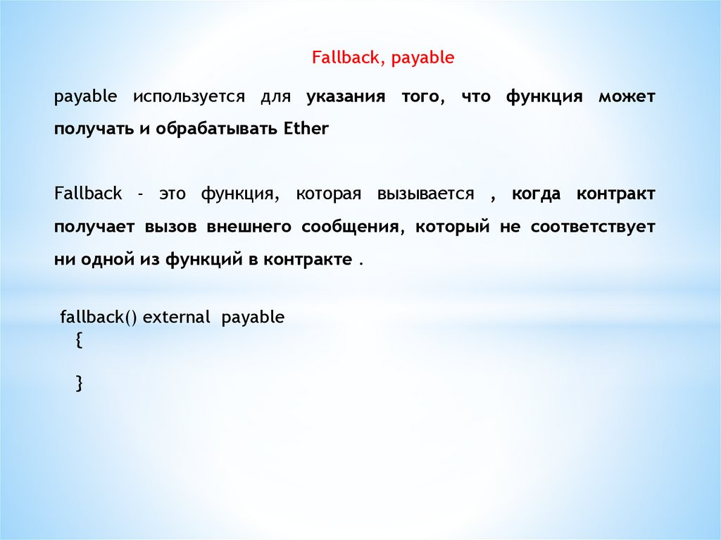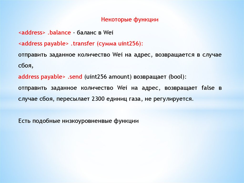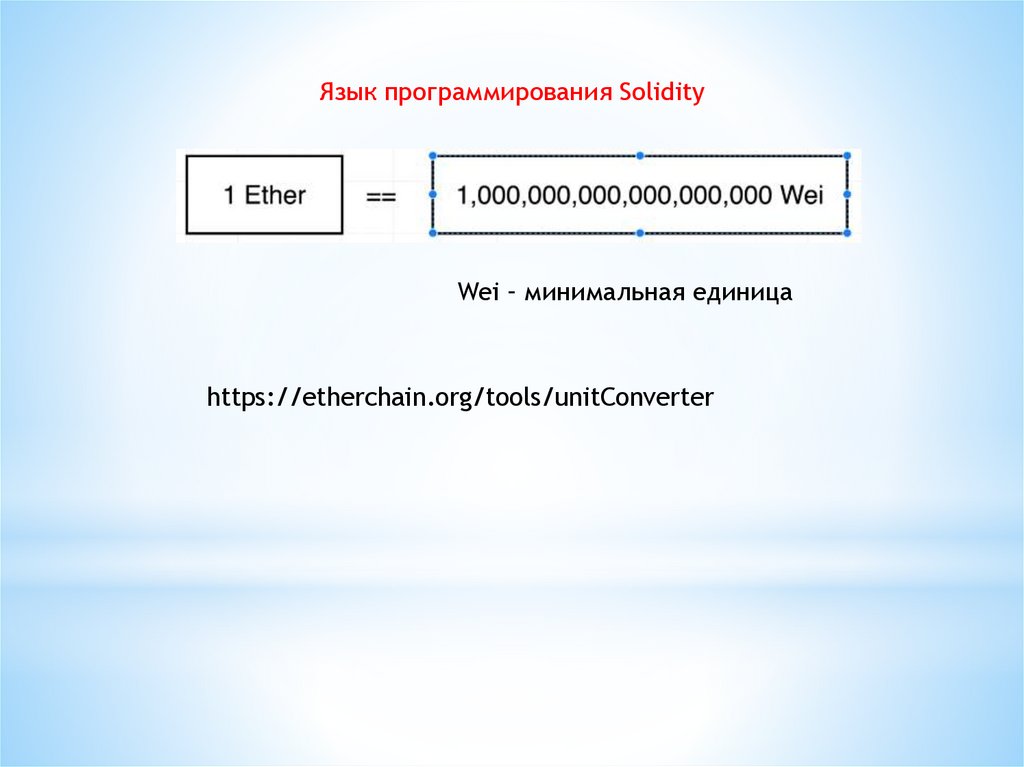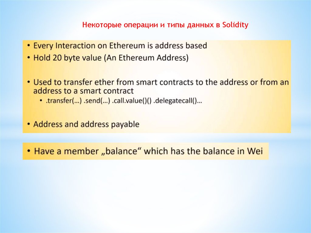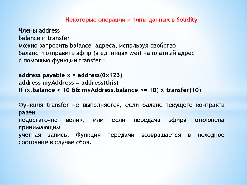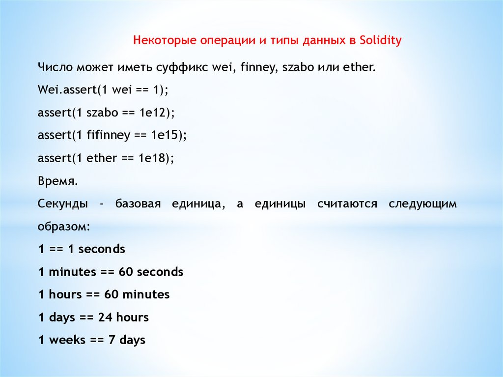 Некоторые операции и типы данных в SolidityЧисло может иметь суффикс wei, finney, szabo или ether.