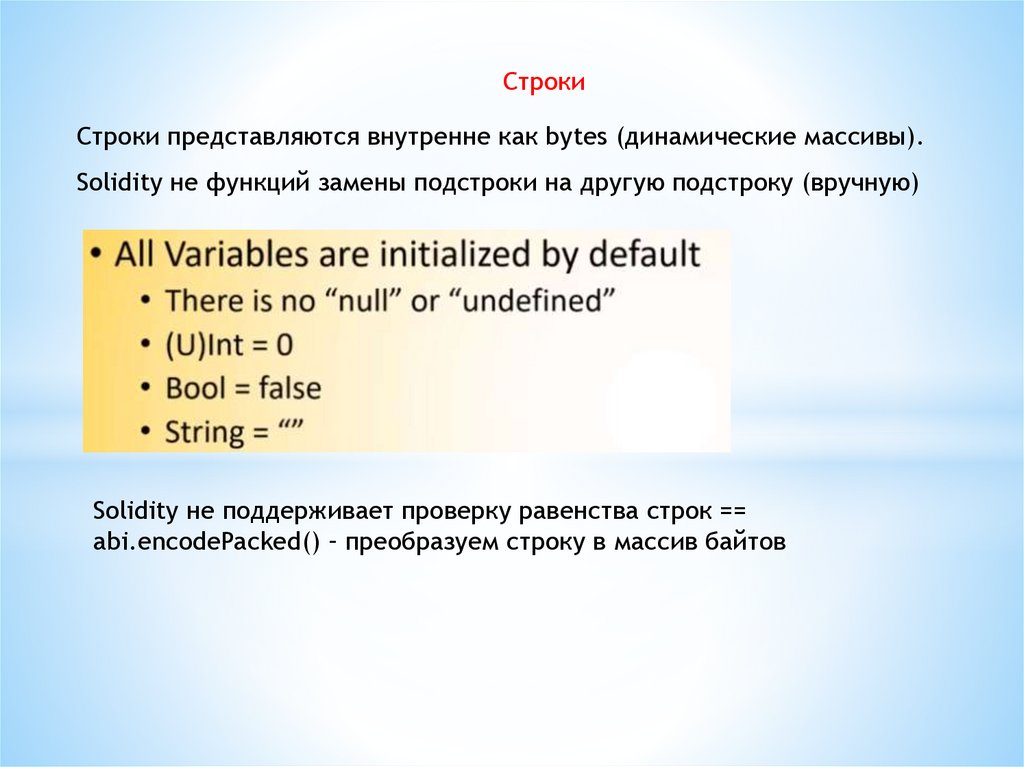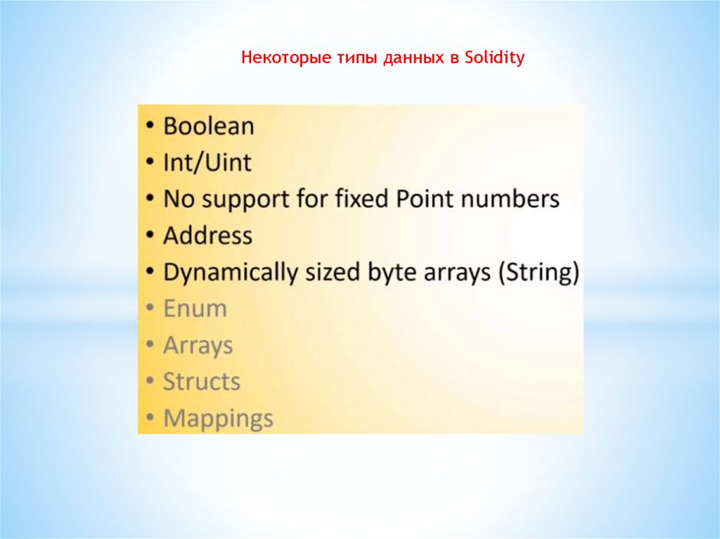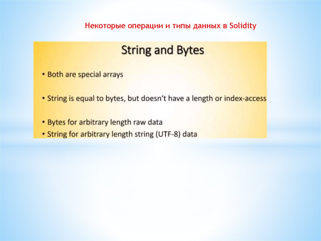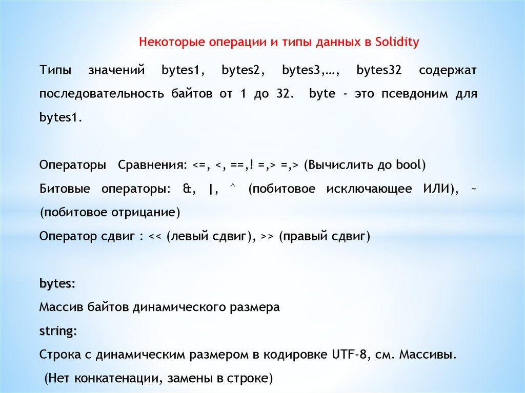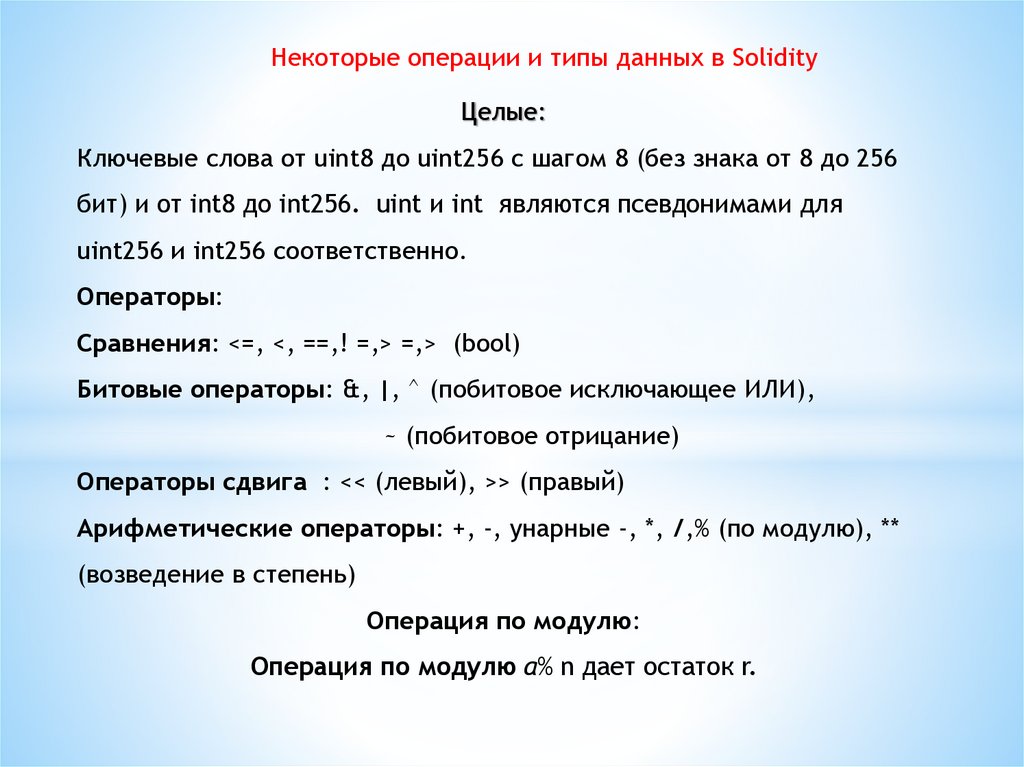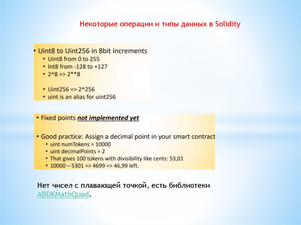 Некоторые операции и типы данных в SolidityНет чисел с плавающей точкой, есть библиотеки