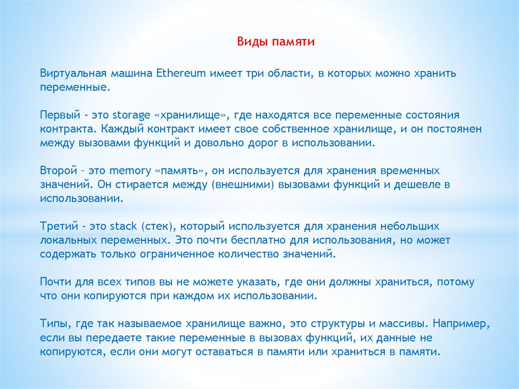Виды памятиВиртуальная машина Ethereum имеет три области, в которых можно хранить