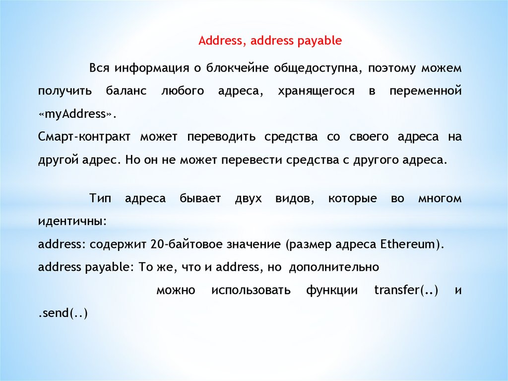 Address, address payableВся информация о блокчейне общедоступна, поэтому можем