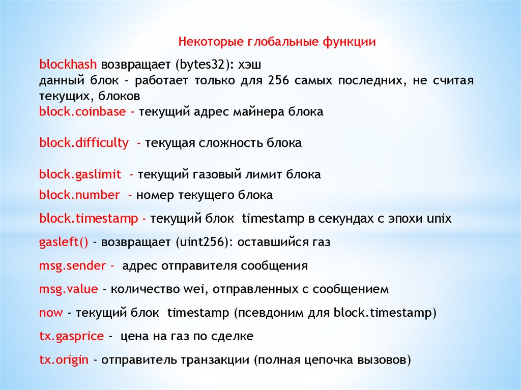 Некоторые глобальные функцииblockhash возвращает (bytes32): хэш