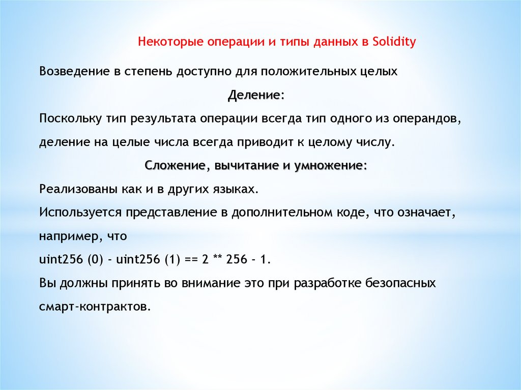 Некоторые операции и типы данных в SolidityВозведение в степень доступно для положительных целых