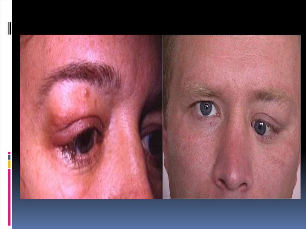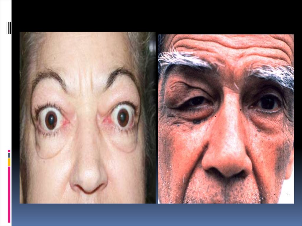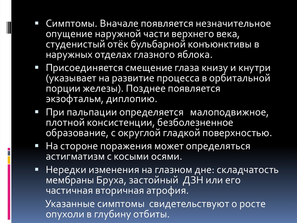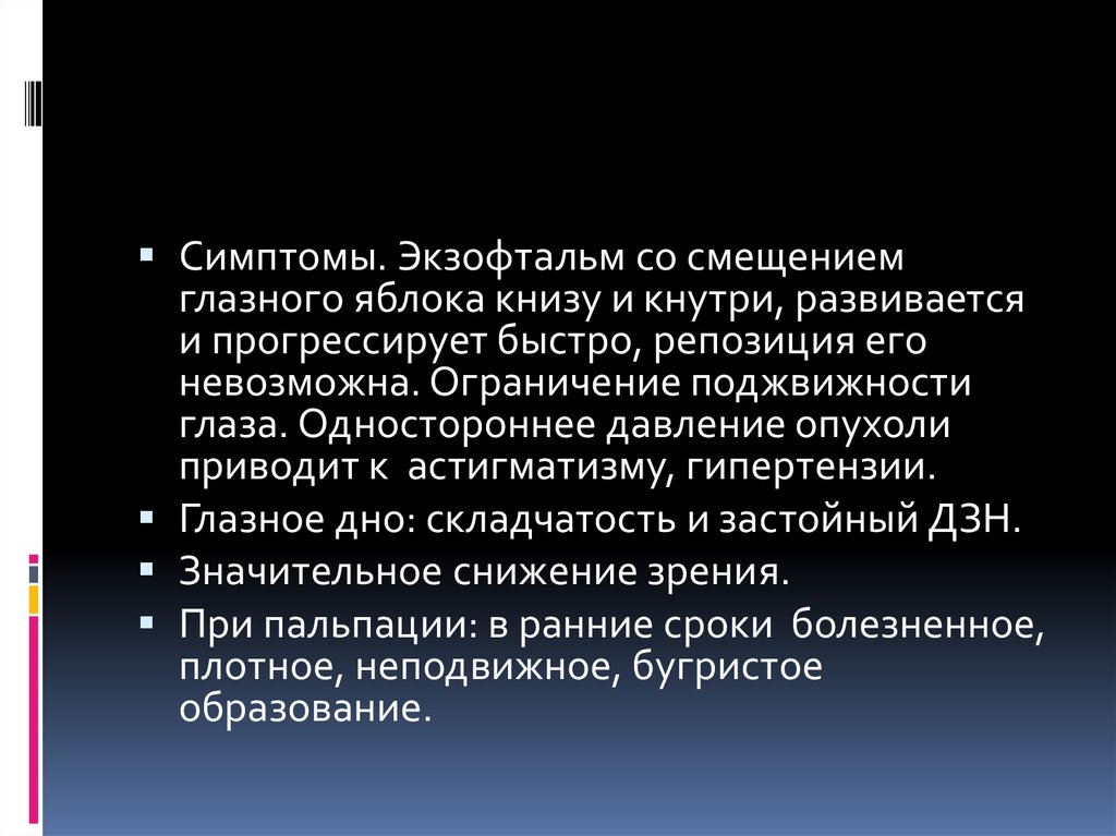 Симптомы. Экзофтальм со смещениемглазного яблока книзу и кнутри, развивается