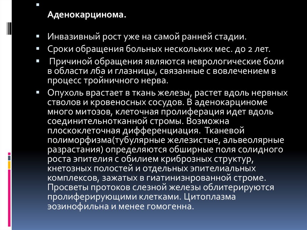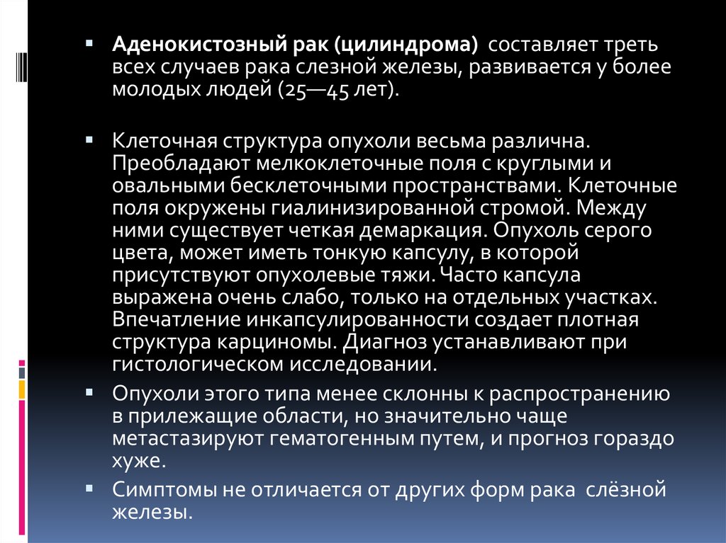 Аденокистозный рак (цилиндрома) составляет третьвсех случаев рака слезной железы, развивается у более