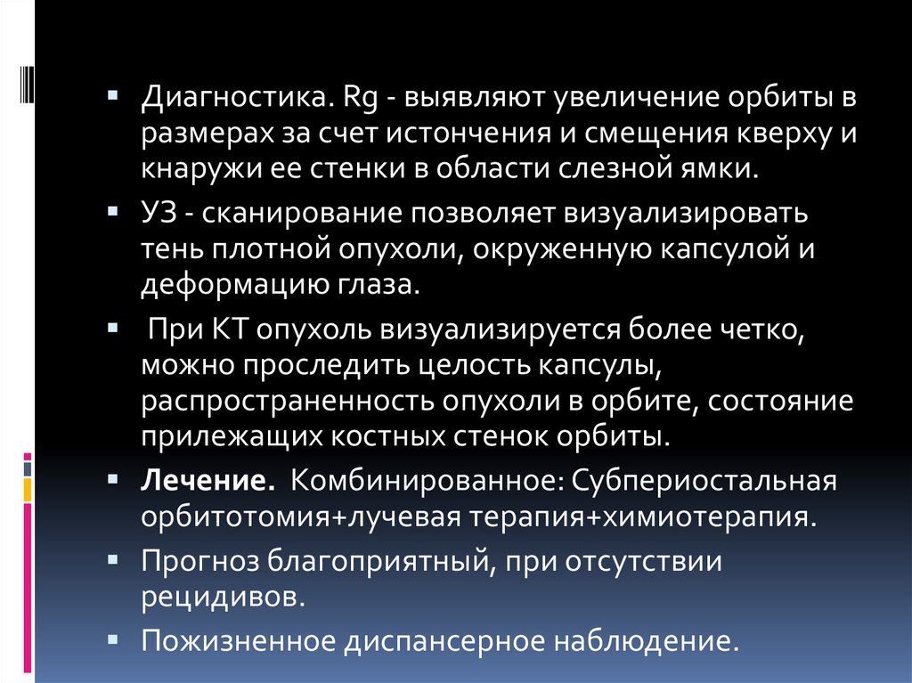 Диагностика. Rg - выявляют увеличение орбиты вразмерах за счет истончения и смещения кверху и