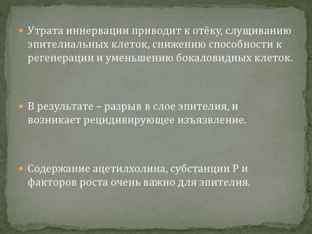 Утрата иннервации приводит к отёку, слущиваниюэпителиальных клеток, снижению способности к