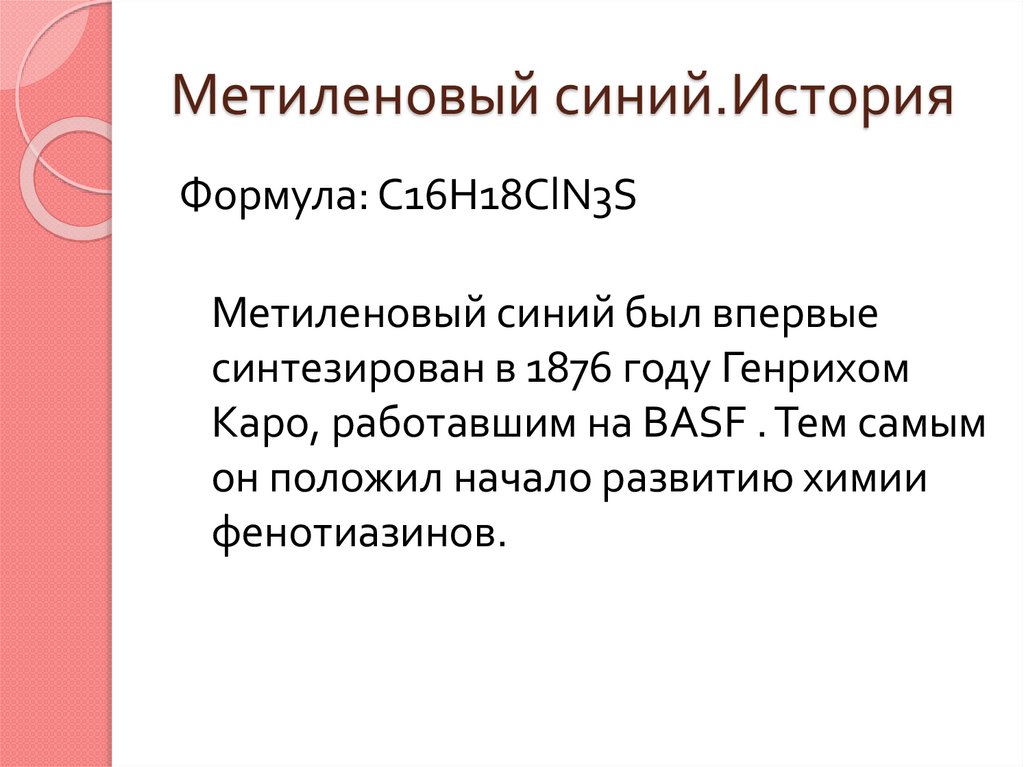 Метиленовый синий.ИсторияФормула: C16H18ClN3S