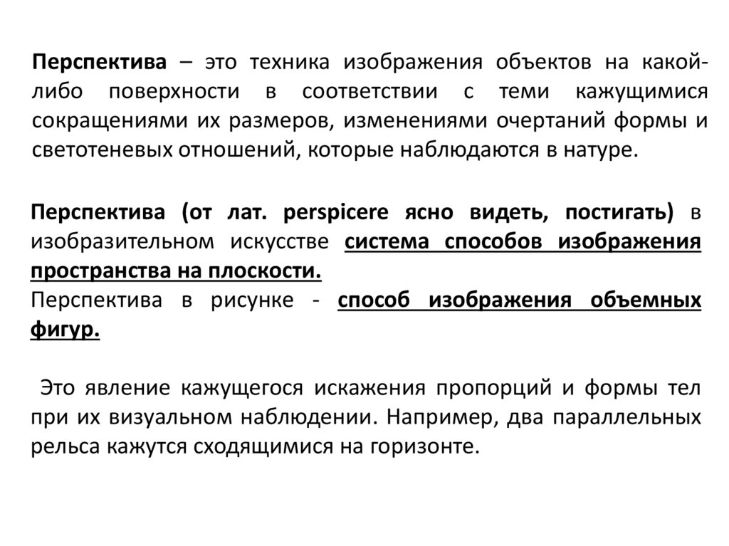 Перспектива – это техника изображения объектов на какойлибо поверхности в соответствии с теми кажущимисясокращениями их размеров, изменениями очертаний формы и