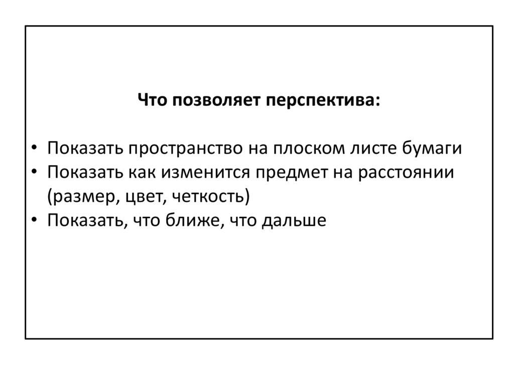 Что позволяет перспектива:• Показать пространство на плоском листе бумаги