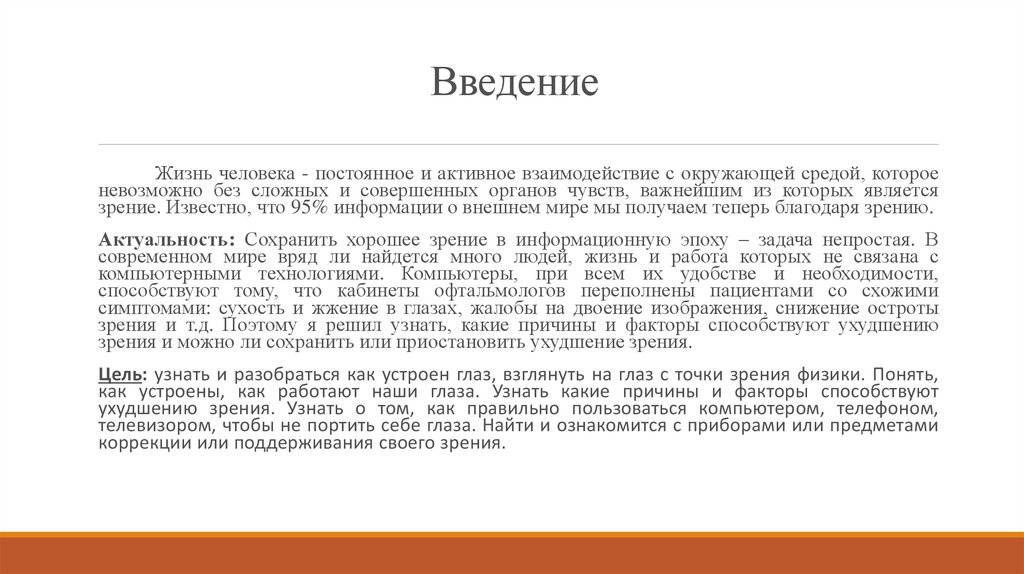 Цель: узнать и разобраться как устроен глаз, взглянуть на глаз с точки зрения физики. Понять,