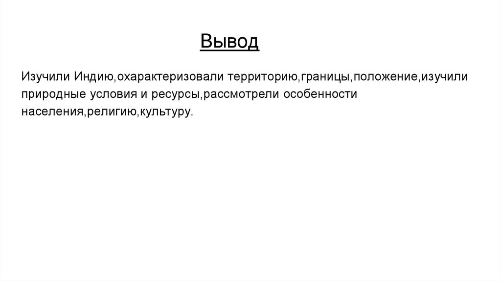 ВыводИзучили Индию,охарактеризовали территорию,границы,положение,изучили