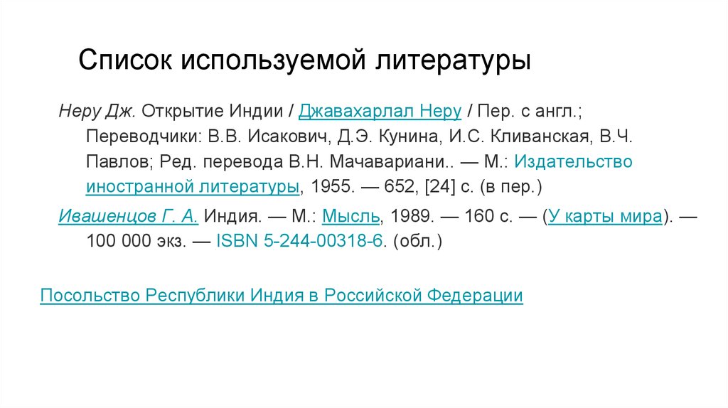 Список используемой литературыНеру Дж. Открытие Индии / Джавахарлал Неру / Пер. с англ.;