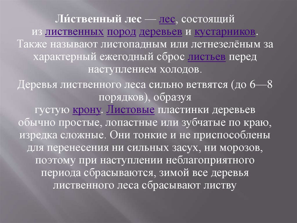Ли́ственный лес — лес, состоящийиз лиственных пород деревьев и кустарников.