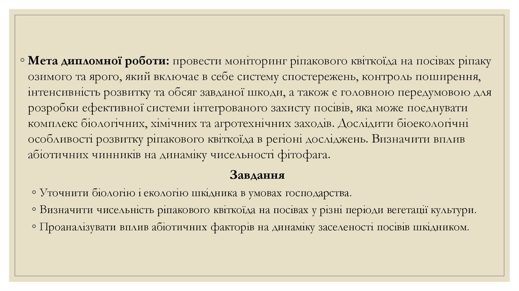 ◦ Мета дипломної роботи: провести моніторинг ріпакового квіткоїда на посівах ріпакуозимого та ярого, який включає в себе систему спостережень, контроль поширення,