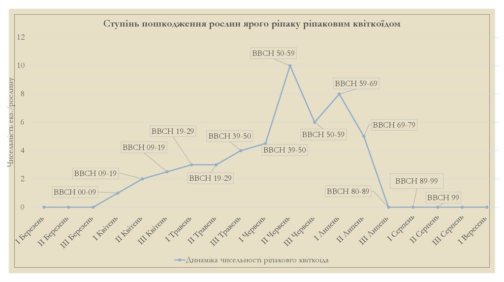 ◦ Пік чисельності квіткоїда на посівах озимого та ярого ріпаку припадає на фазу бутонізації, коли імаго живиться