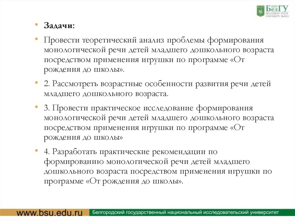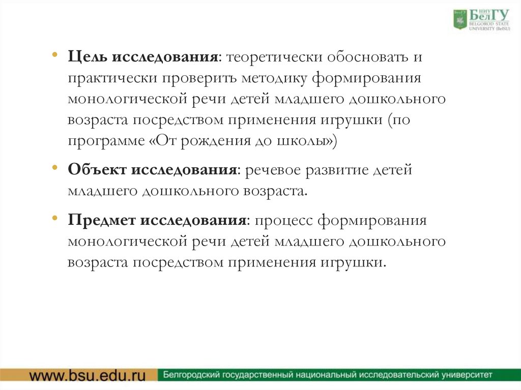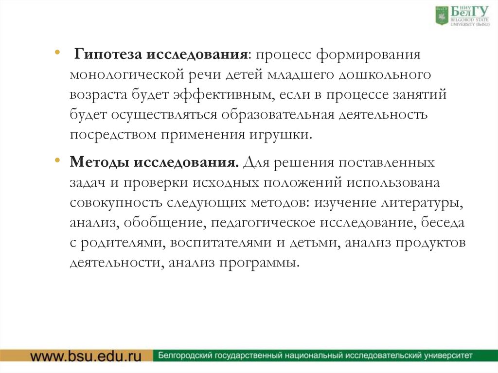 • Гипотеза исследования: процесс формированиямонологической речи детей младшего дошкольного