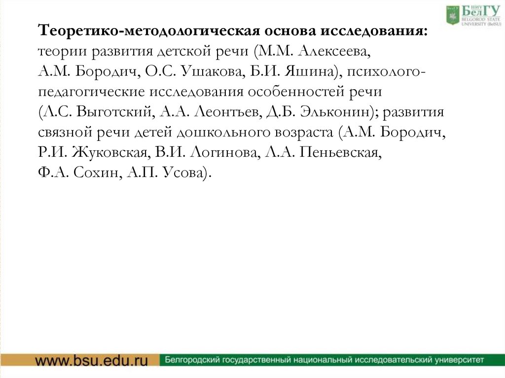 Теоретико-методологическая основа исследования:теории развития детской речи (М.М. Алексеева,