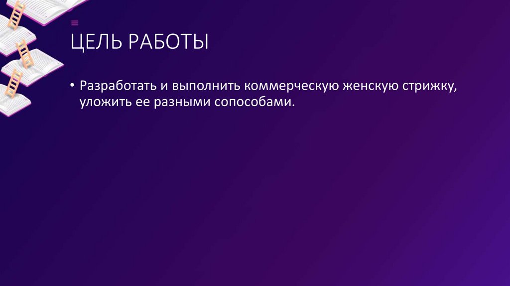 ЦЕЛЬ РАБОТЫ• Разработать и выполнить коммерческую женскую стрижку,