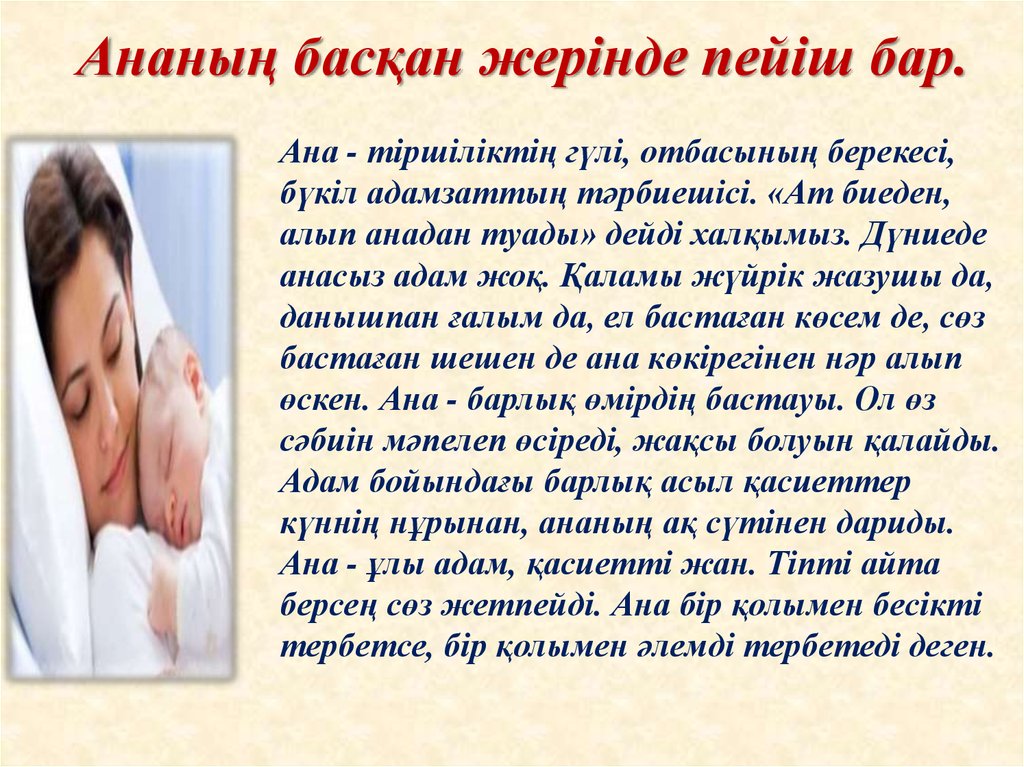 Ананың басқан жерінде пейіш бар.Ана - тіршіліктің гүлі, отбасының берекесі,