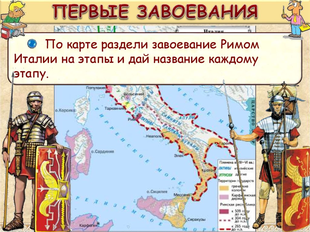По карте раздели завоевание РимомИталии на этапы и дай название каждому