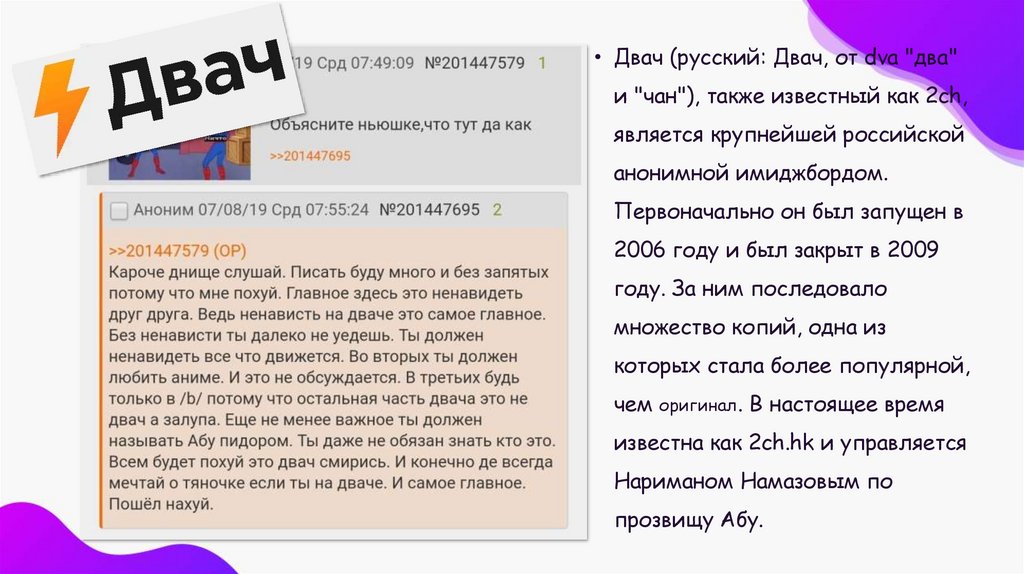 • Двач (русский: Двач, от dva "два"и "чан"), также известный как 2ch,