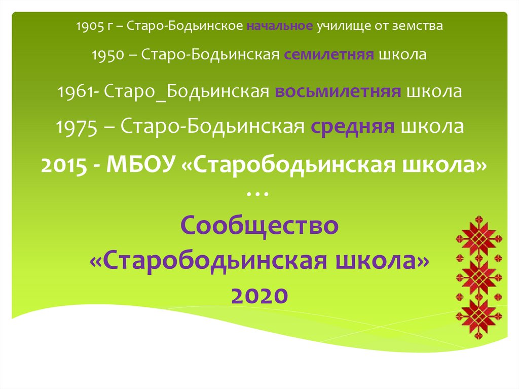 1905 г – Старо-Бодьинское начальное училище от земства1950 – Старо-Бодьинская семилетняя школа