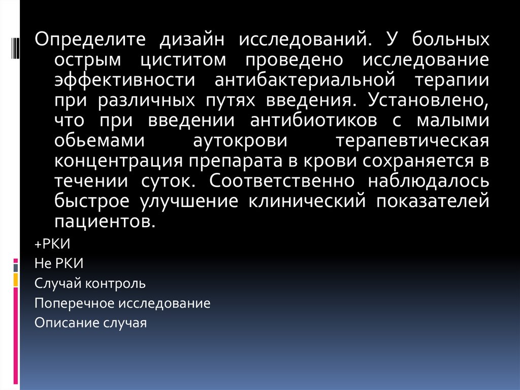 Определите дизайн исследований. У больныхострым циститом проведено исследование