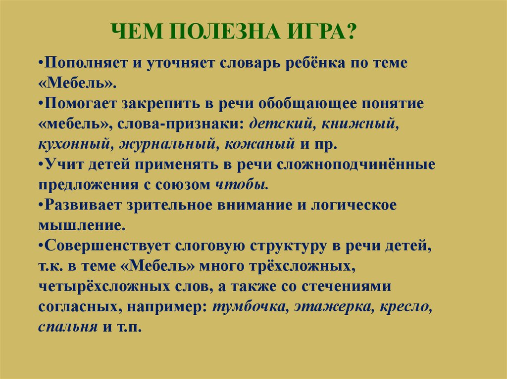 ЧЕМ ПОЛЕЗНА ИГРА?•Пополняет и уточняет словарь ребёнка по теме
