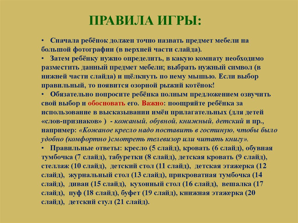 ПРАВИЛА ИГРЫ:• Сначала ребёнок должен точно назвать предмет мебели на