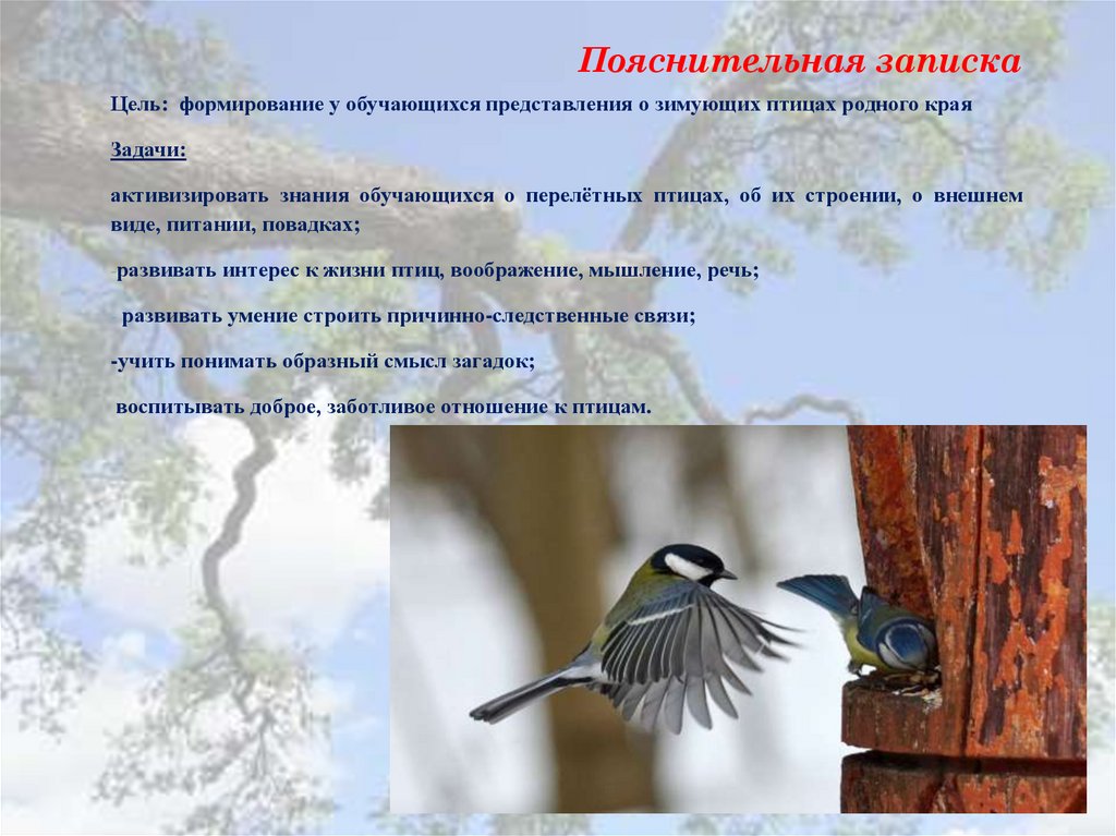 Пояснительная запискаЦель: формирование у обучающихся представления о зимующих птицах родного края