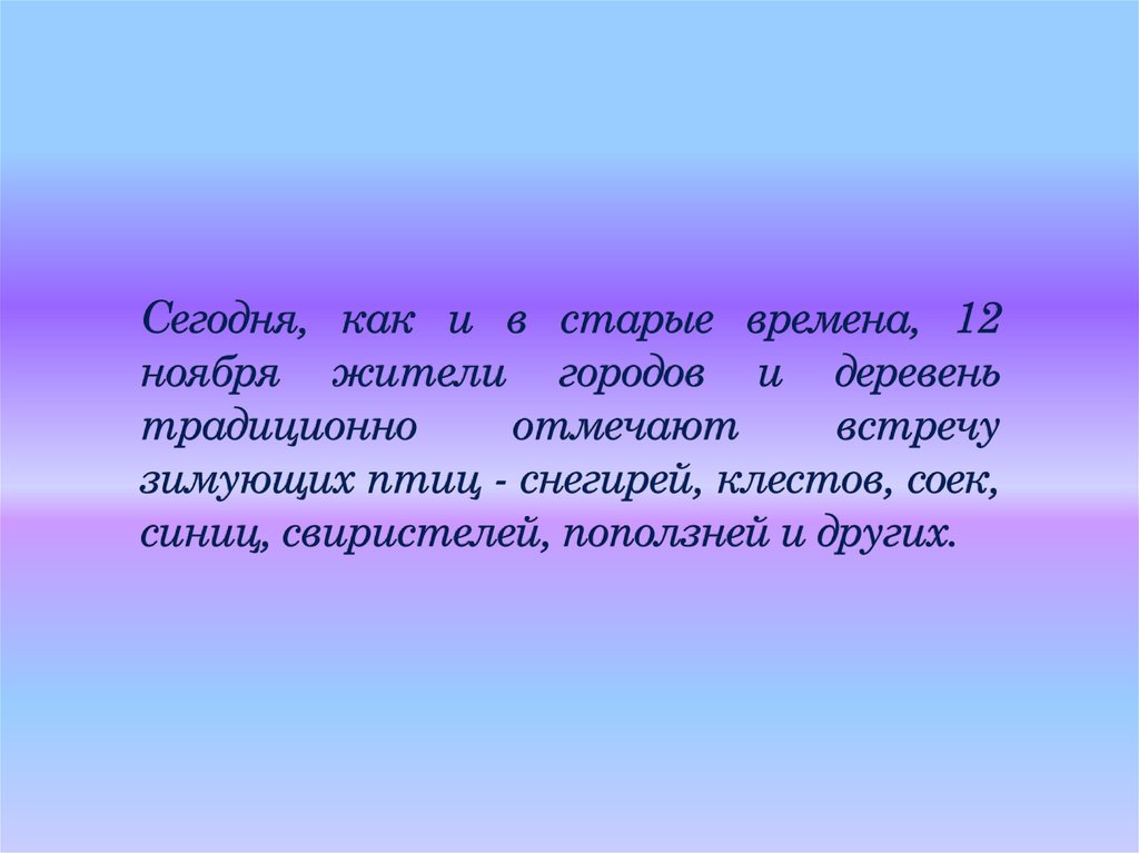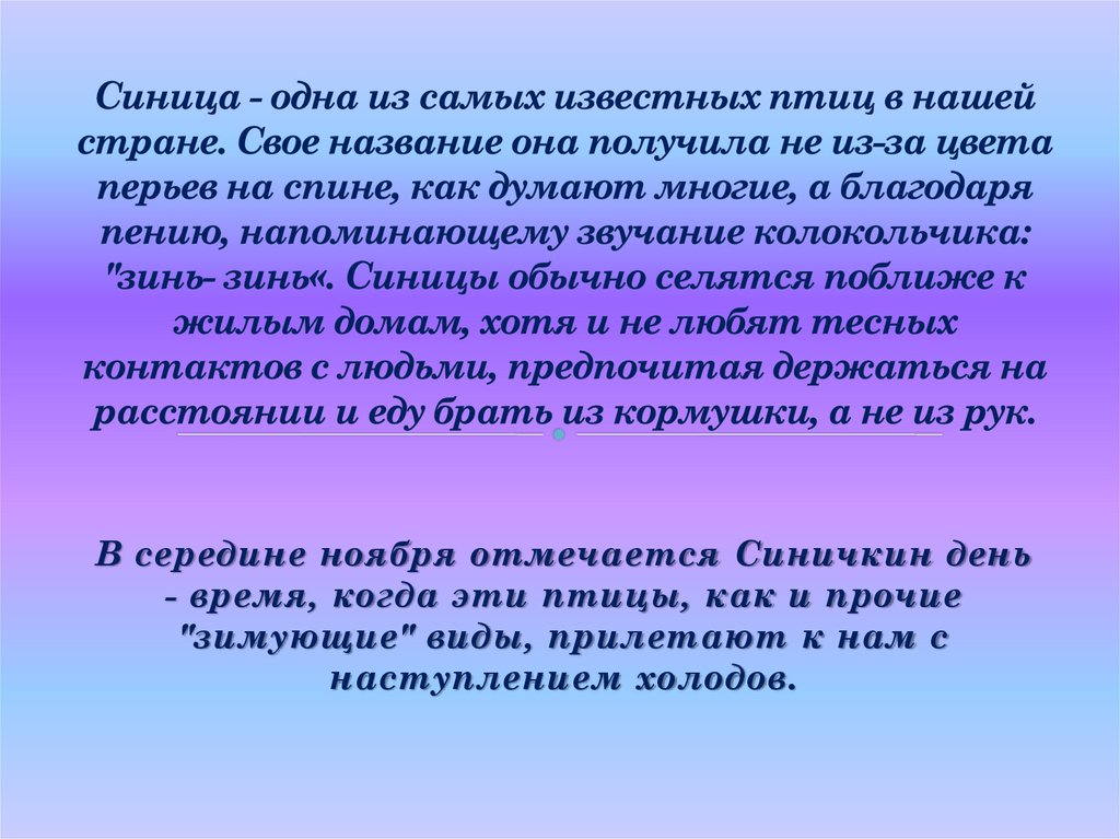 В середине ноября отмечается Синичкин день- время, когда эти птицы, как и прочие