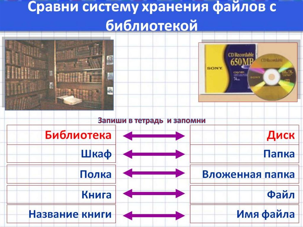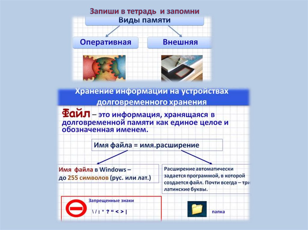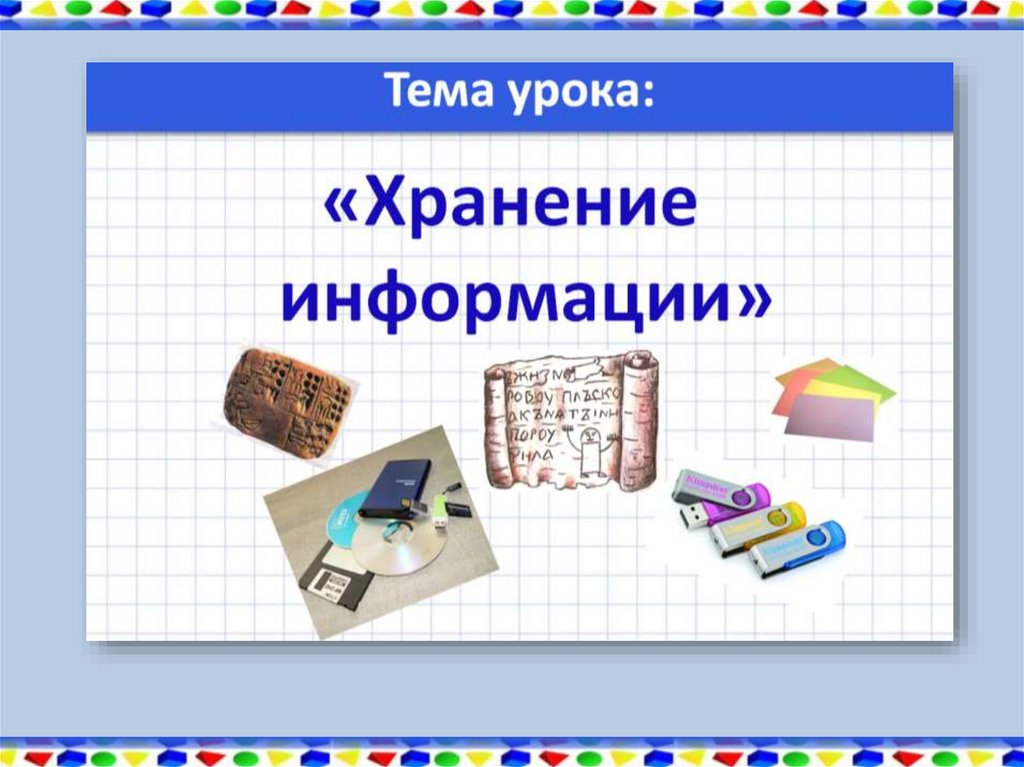 -Записать в тетрадь тему: «Хранение информации» со слайда 2, в тетради раскрыть основные понятия: «носитель