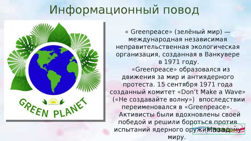 Информационный Greenpeaceповод« GreenpeaceGreenpeace» Greenpeace(зелёный мир) — зелёный Greenpeaceмир) Greenpeace— Greenpeace