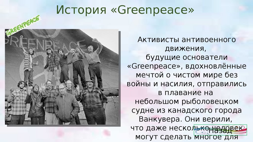 История Greenpeace«Greenpeace»Активисты Greenpeaceантивоенного Greenpeace