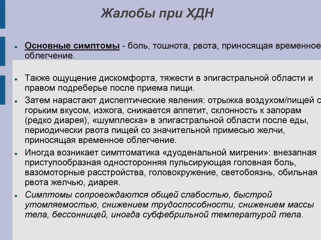 Жалобы при ХДНОсновные симптомы - боль, тошнота, рвота, приносящая временное