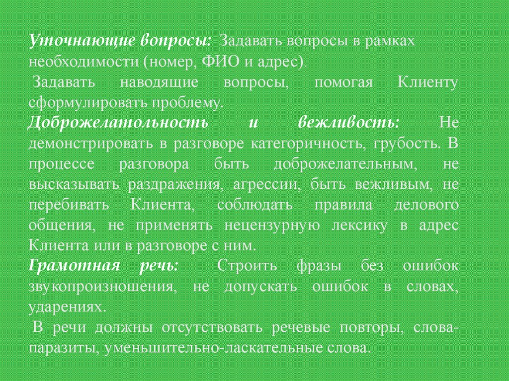 Уточнающие вопросы: Задавать вопросы в рамкахнеобходимости (номер, ФИО и адрес).