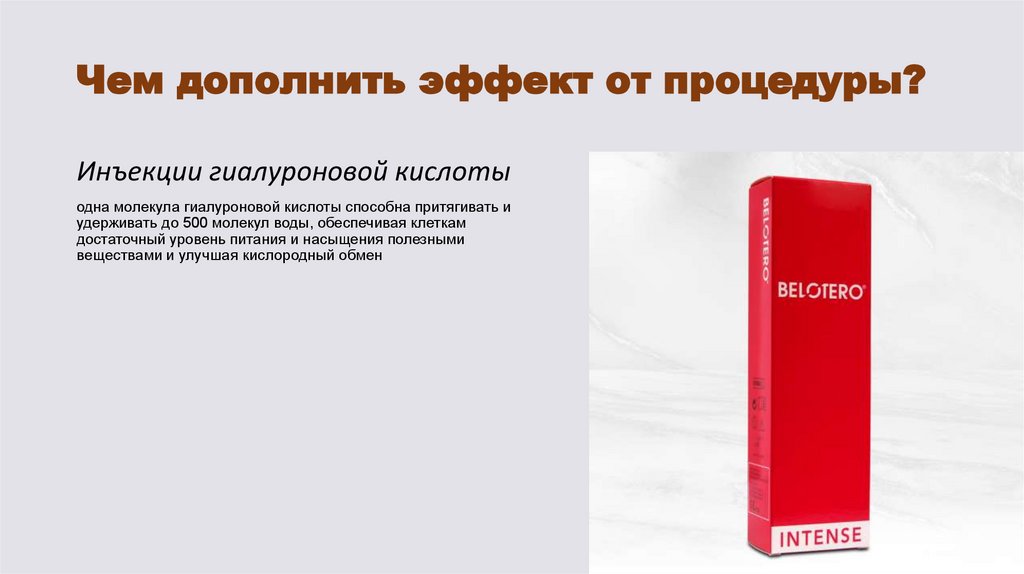 Чем дополнить эффект от процедуры?Инъекции гиалуроновой кислоты