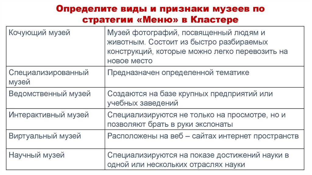 Определите виды и признаки музеев постратегии «Меню» в Кластере