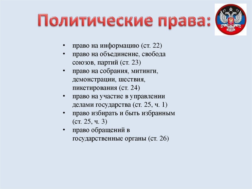 • право на информацию (ст. 22)• право на объединение, свобода