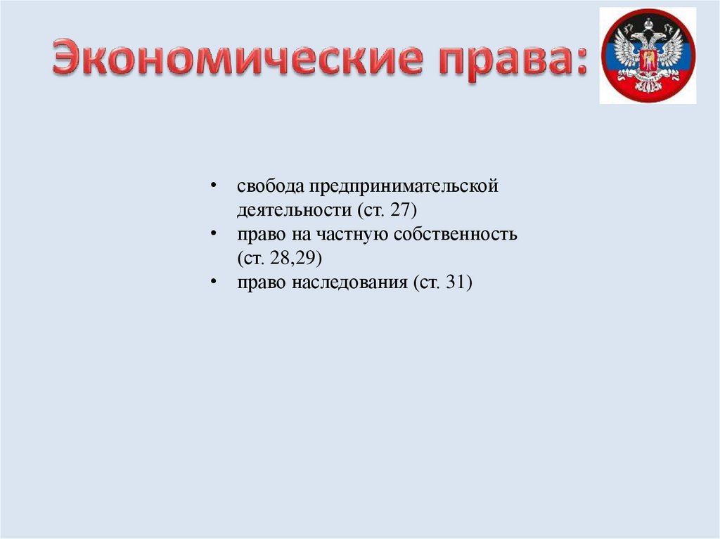 • свобода предпринимательскойдеятельности (ст. 27)