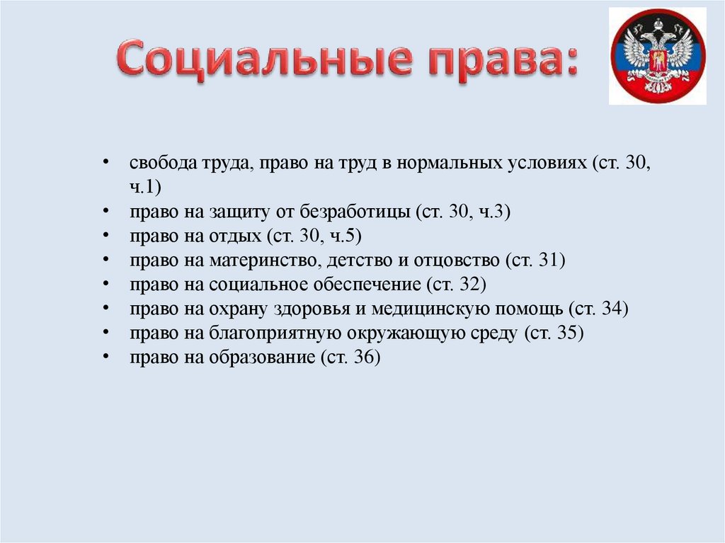 • право на социальное обеспечение (ст. 32)