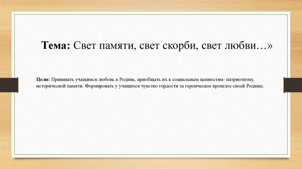 Тема: Свет памяти, свет скорби, свет любви…»Цели: Прививать учащимся любовь к Родине, приобщать их к социальным ценностям- патриотизму,