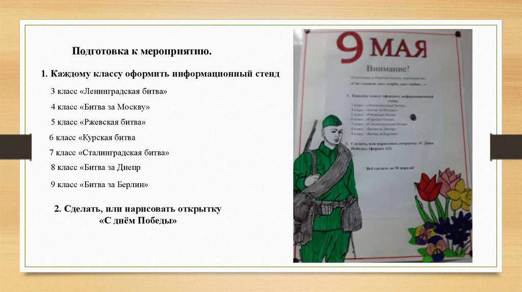 Подготовка к мероприятию.1. Каждому классу оформить информационный стенд