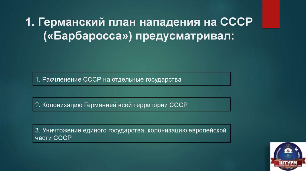 1. Германский план нападения на СССР(«Барбаросса») предусматривал: