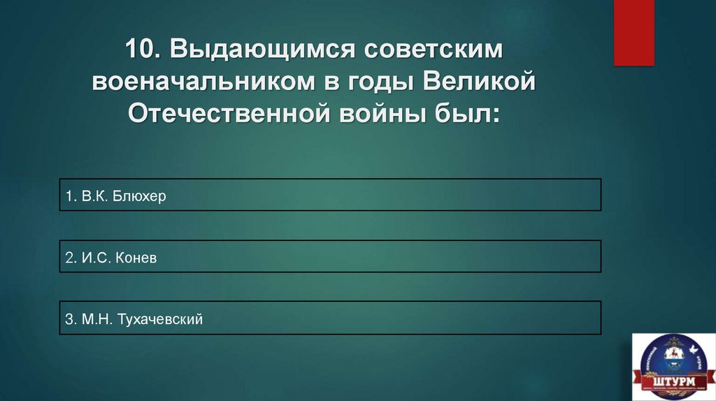 10. Выдающимся советскимвоеначальником в годы Великой