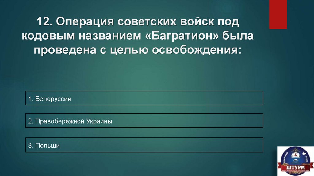 12. Операция советских войск подкодовым названием «Багратион» была