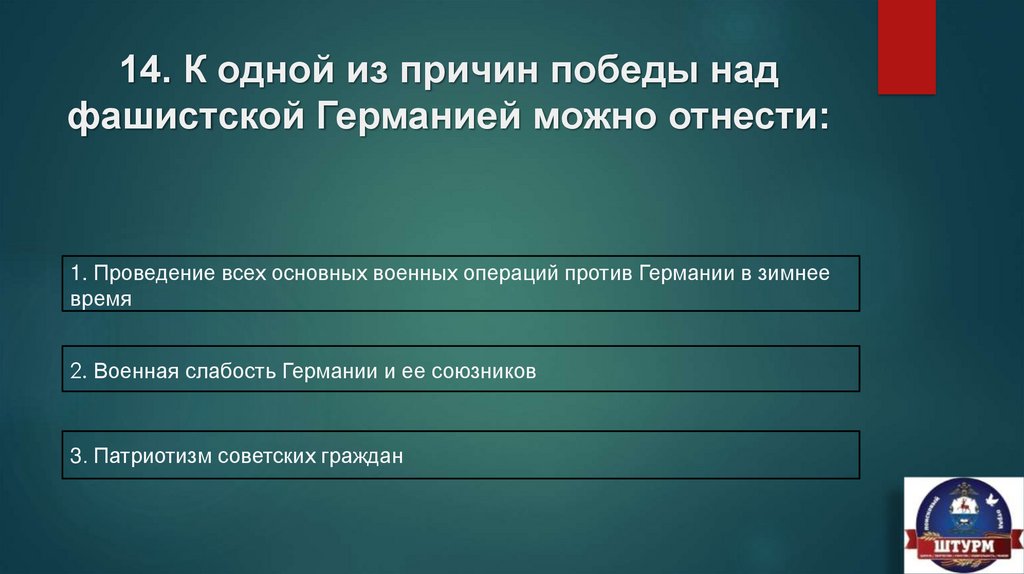14. К одной из причин победы надфашистской Германией можно отнести: