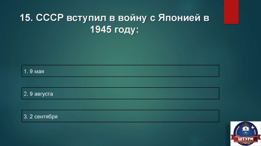 15. СССР вступил в войну с Японией в1945 году: