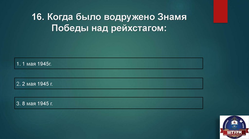 16. Когда было водружено ЗнамяПобеды над рейхстагом: