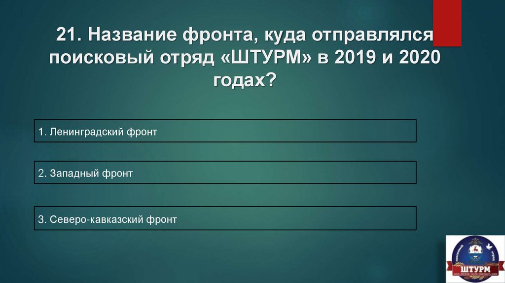 21. Название фронта, куда отправлялсяпоисковый отряд «ШТУРМ» в 2019 и 2020